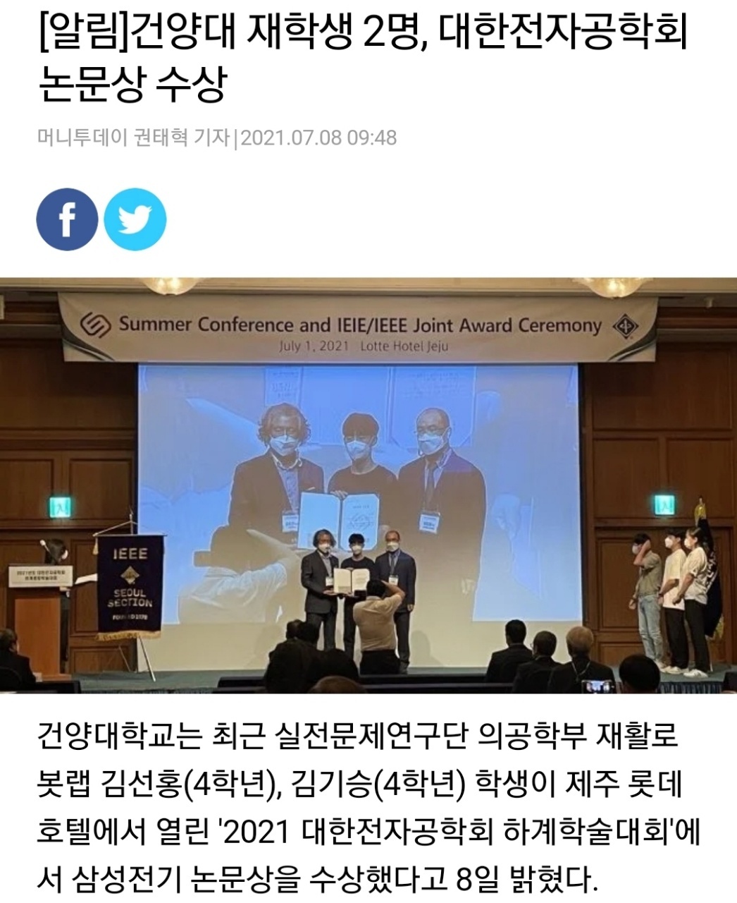 『 [축]4학년 김선홍/김기승 대한전자공학회 논문상 수상 』글의 상세내용을 확인하는 표로 제목, 부서명, 등록일, 조회, 첨부, 내용으로 나뉘어 설명합니다.