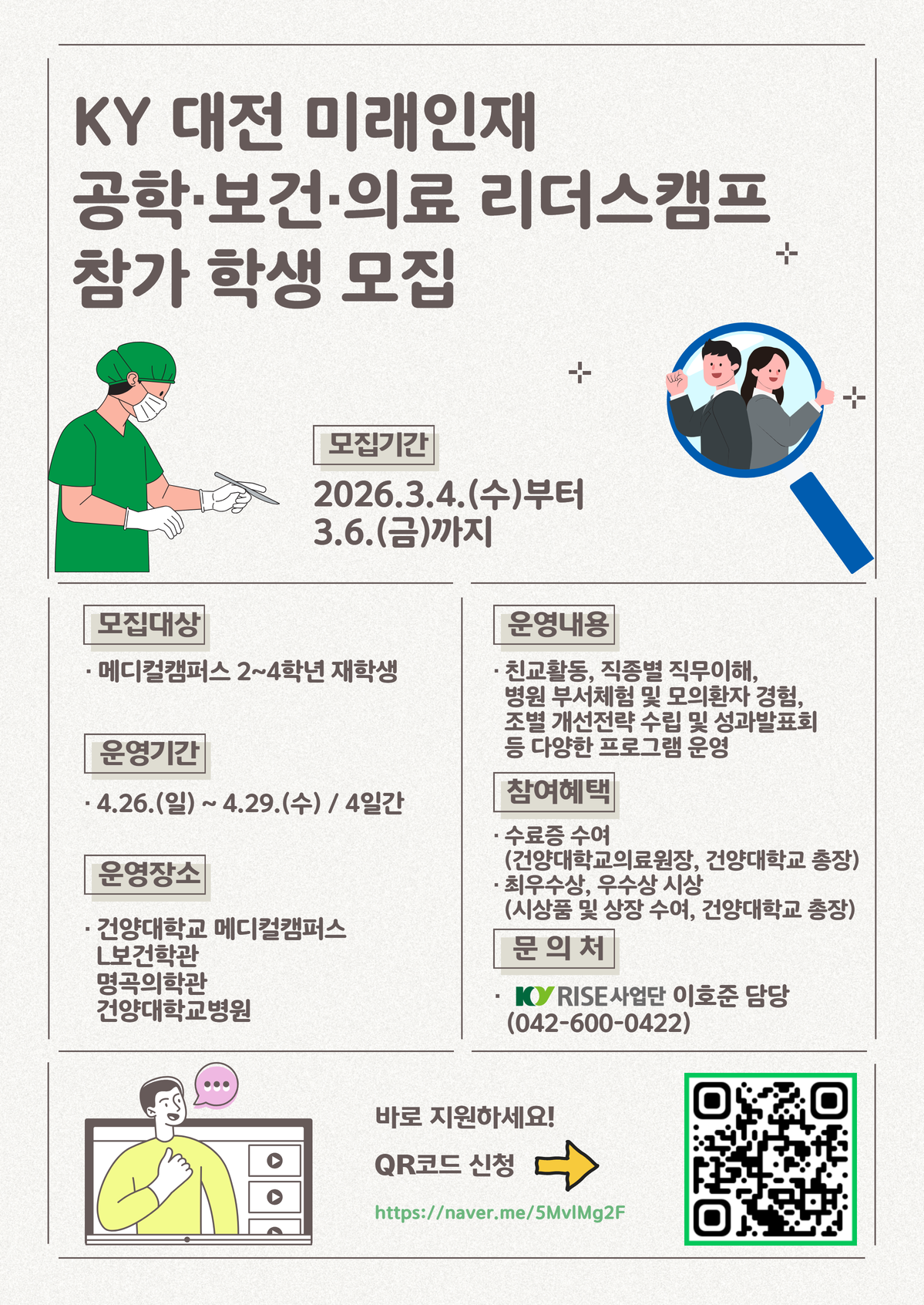 『 KY 대전 미래인재 공학, 보건, 의료 리더스캠프 학생 모집 』글의 상세내용을 확인하는 표로 제목, 부서명, 등록일, 조회, 첨부, 내용으로 나뉘어 설명합니다.