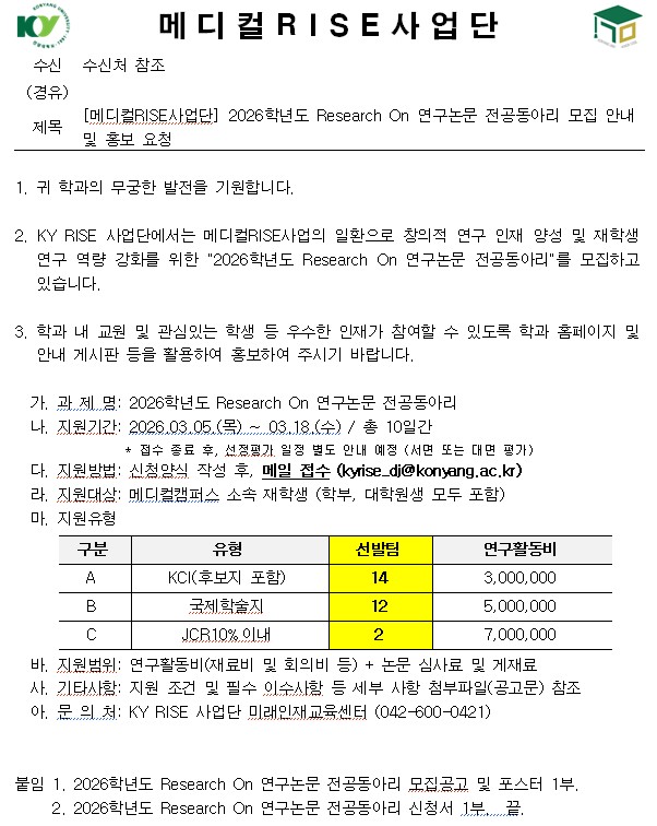 | 제목 | [메디컬RISE사업단] 2026학년도 Research On 연구논문 전공동아리 모집 안내 | ||||