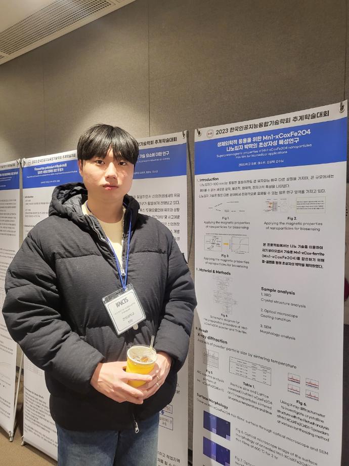 2023 한국인공지능융합기술학회 추계학술대회 참가 및 우수 논문상(Poster 세션) 수상 - 학회일자 : 2023.11.10(금)~11.11(토) - 수상현황 1. 생체의학적 응용을 위한 Mn1-xCoxFe2O4 나노입자 박막의 초상자성 특성연구 이수완, 최환, 김성백(건양대) |