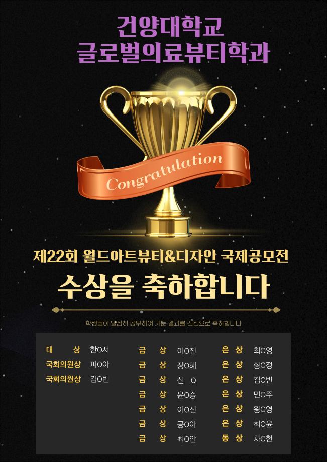 제 22회 월드뷰티아트&디자인 국제공모전에서 건양대학교 글로벌의료뷰티학과 재학생들이 출전하여 수상의 쾌거를 이뤄냈습니다^^