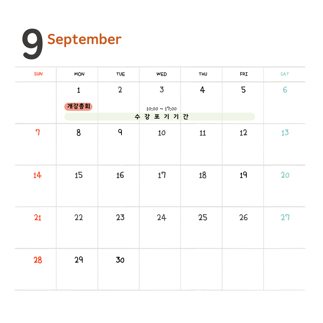 9월은 새로운 학기의 시작과 함께 캠퍼스가 다시 활기를 되찾는 시간입니다. 이번 9월 한 달이 모두에게 뜻깊고 풍성한 시간이 되기를 바라며, 학사일정을 참고하여 주시기바랍니다.