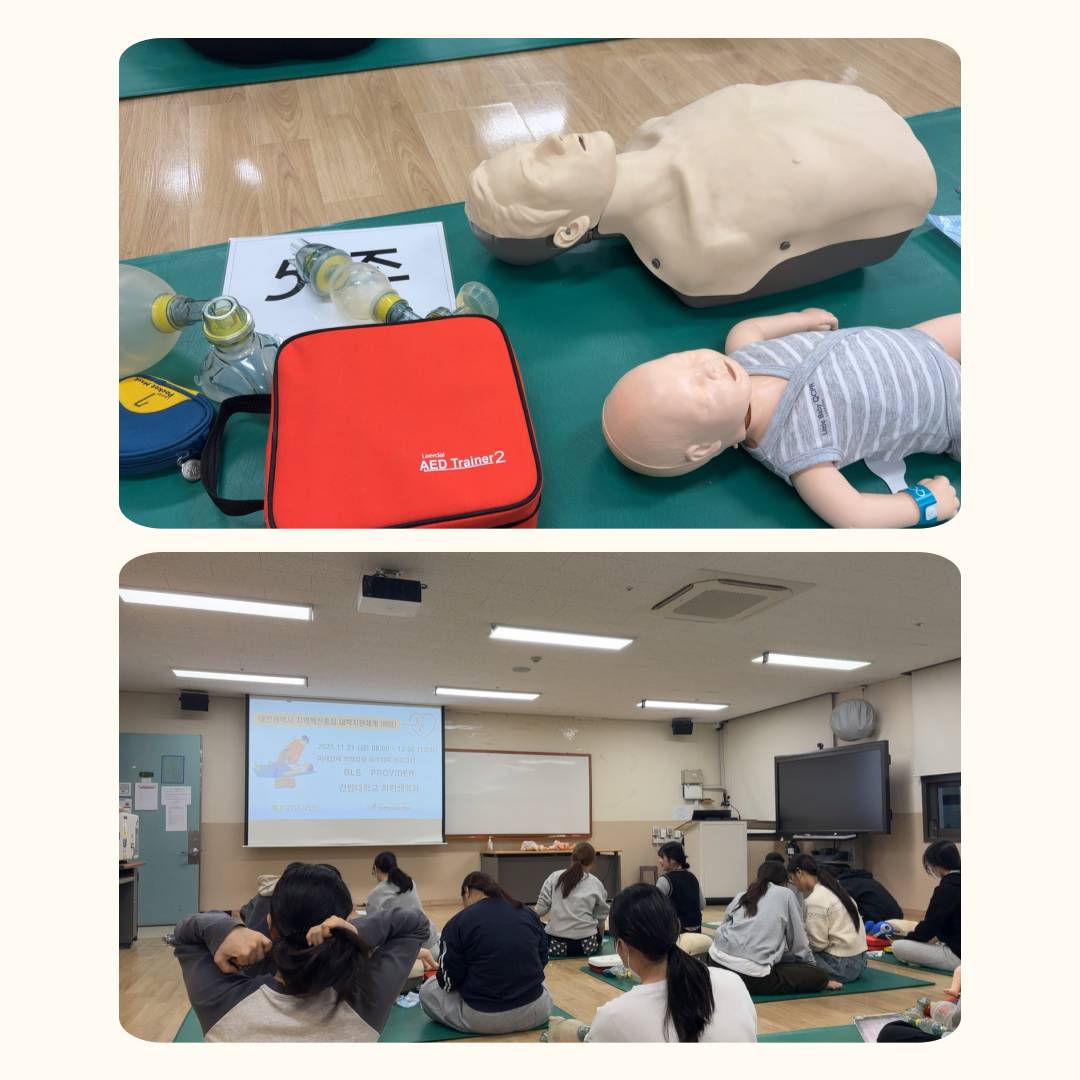 2025년 11월 17일과 21일에 BLS 교육을 진행하였습니다! 심폐소생술의 기본 원칙과 응급 상황 대처법을 직접 실습하며 생명을 살릴 수 있는 역량을 다시 한 번 배우는 뜻깊은 시간이었습니다 |