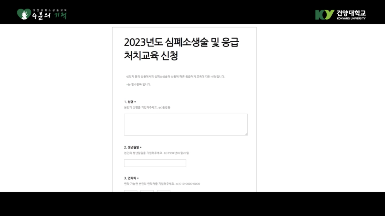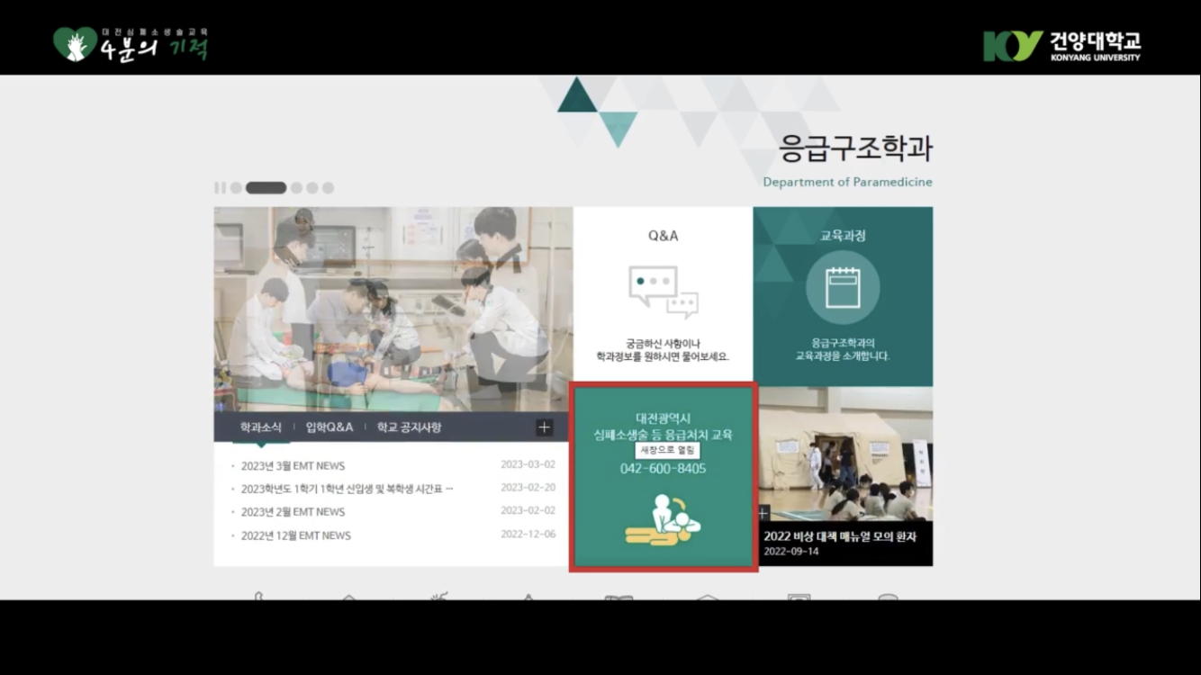 『 건양대학교 응급구조학과 심폐소생술 교육 신청 및 모집 기간 』글의 상세내용을 확인하는 표로 제목, 부서명, 등록일, 조회, 첨부, 내용으로 나뉘어 설명합니다.