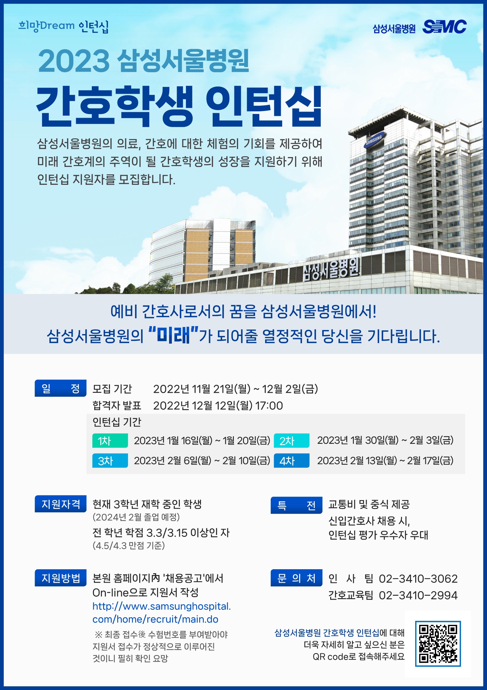 | 제목 | [재학생 3학년 대상] 2023 삼성서울병원 간호학생 인턴십 | ||||
