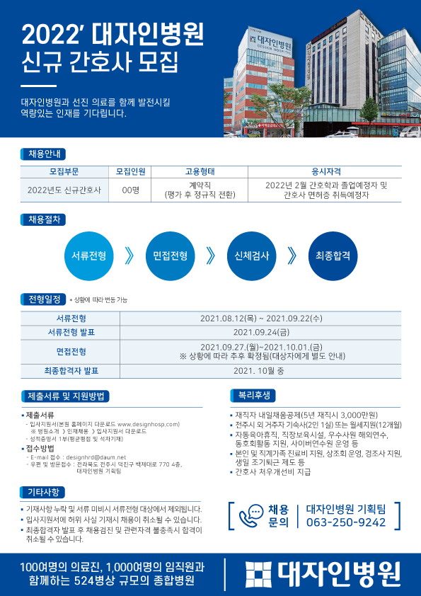『 [채용공고] 2022년도 대자인병원 신규 간호사 모집 』글의 상세내용을 확인하는 표로 제목, 부서명, 등록일, 조회, 첨부, 내용으로 나뉘어 설명합니다.