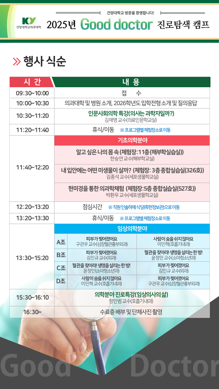 | 제목 | [2025.08.02.(토)] 2025학년도 의과대학 Good doctor 진로탐색캠프 | ||||