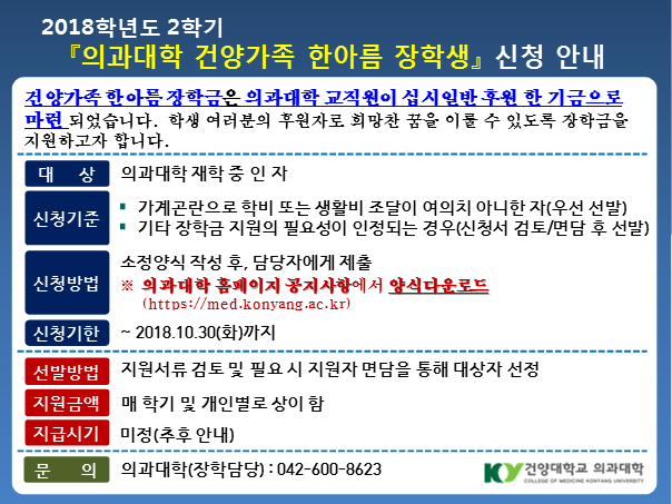| 제목 | 2018학년도 2학기 「의과대학 건양가족 한아름 장학생」 신청안내 | ||||