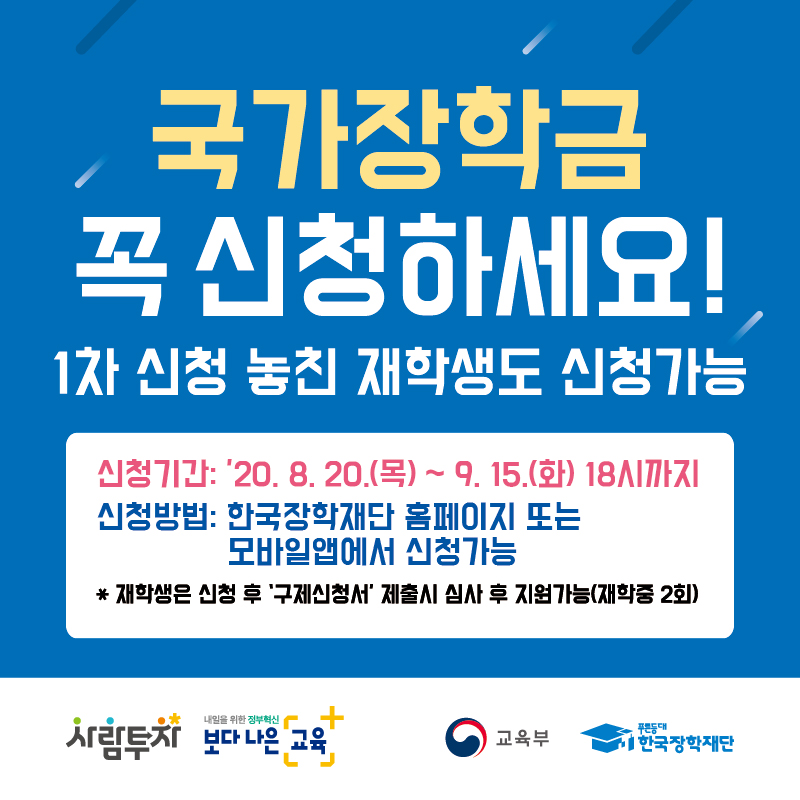 가. 신청기간 : 2020.08.20(목) ~ 09.15(화)까지 나. 신청대상 : 신입생・편입생・재입학・복학생 및 1차 미신청 재학생* * 재학생은 신청 후 ‘구제신청서’ 제출 시 심사 후 지원 가능 (재학 기간 중 2회에 한함) 다. 신청방법 : - 한국장학재단홈페이지(http://www.kosaf.go.kr/) 또는 -‘한국장학재단’모바일 앱을 통해 신청