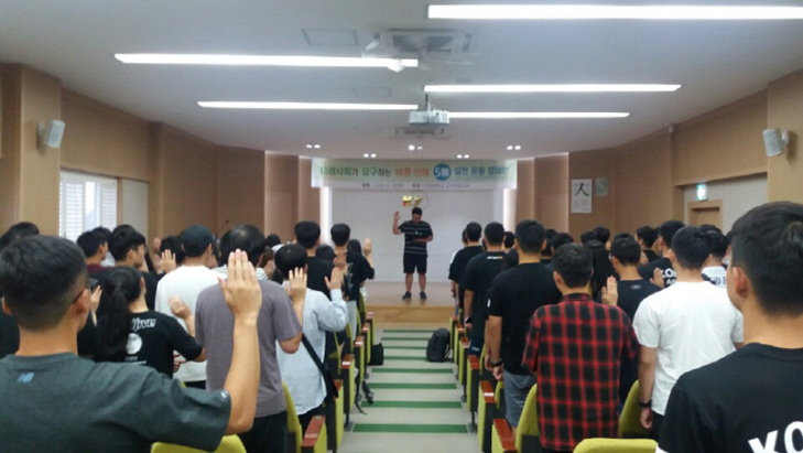 건양대(총장 이원묵) 군사경찰대학은 30일 오후 논산 메디컬캠퍼스 충무홀에서 군사경찰대학 재학생과 교직원 등 300여명이 모인 가운데 無음주, 無흡연, 無시험부정, 無폭력, 無갑질을 다짐하는 '5無 실천운동' 캠페인 발대식을 열었다.