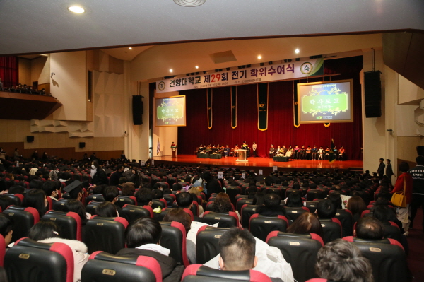 건양대학교(총장 김용하)가 16일 오후 논산에 위치한 창의융합캠퍼스 건양문화콘서트홀에서 졸업생과 학부모 천여 명과 대학 교직원들이 참여한 가운데 제29회 전기 학위수여식을 개최했다.
