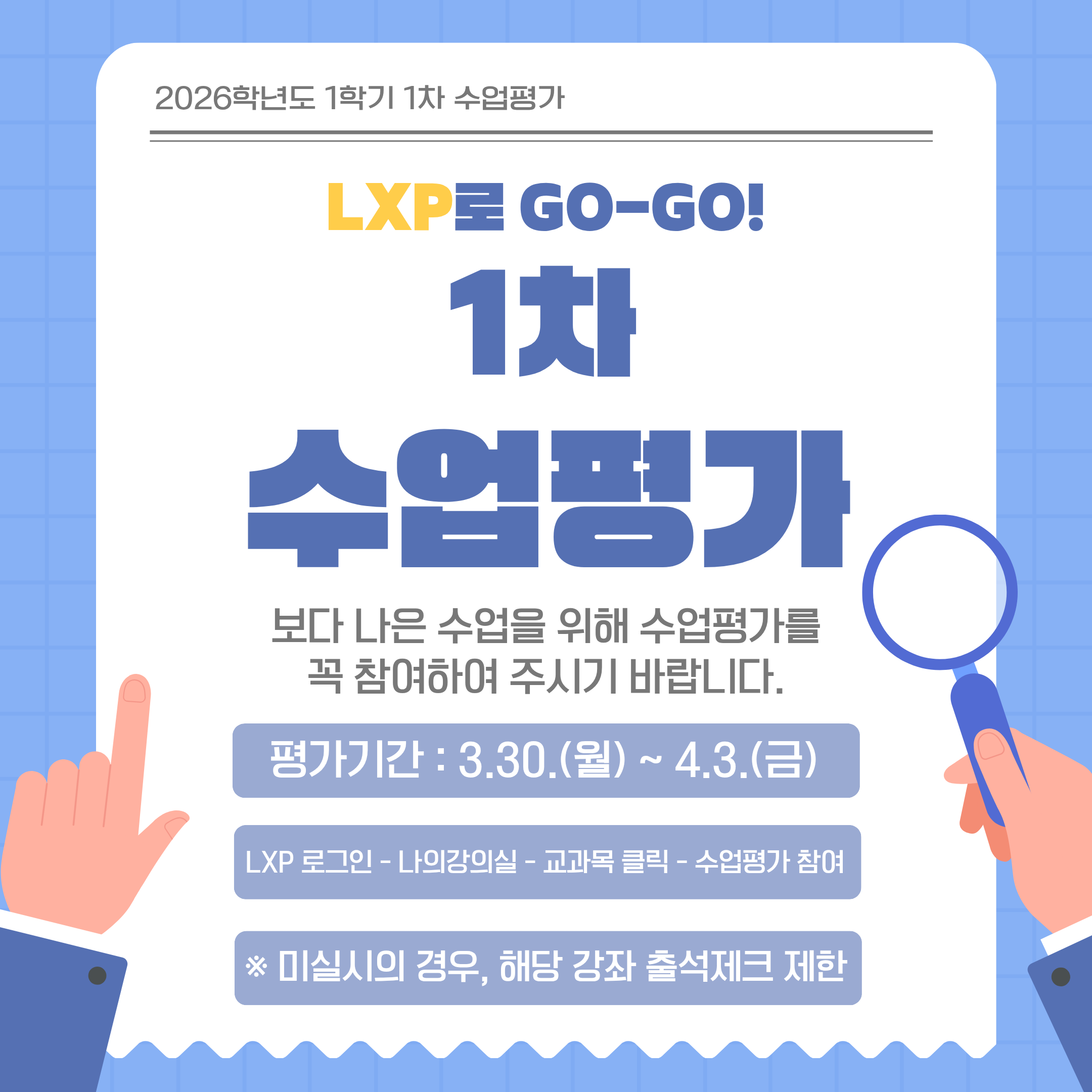 2026학년도 1학기 1차 수업평가[학기제 및 1TERM]를 다음과 같이 안내 드립니다. * 방법 : LXP로그인 => 나의강의실 => 교과목 클릭 => 수업평가 참여 => 3.27.(금) 17:00부터 수업평가 가능 |