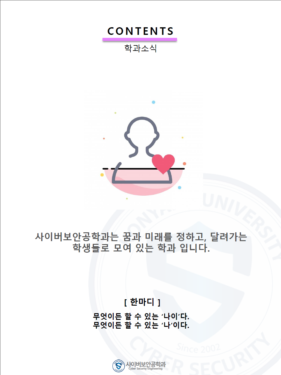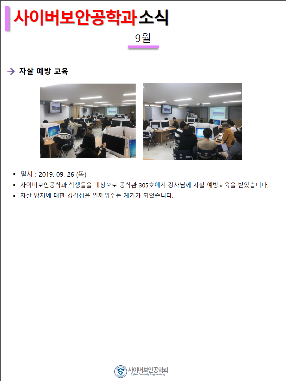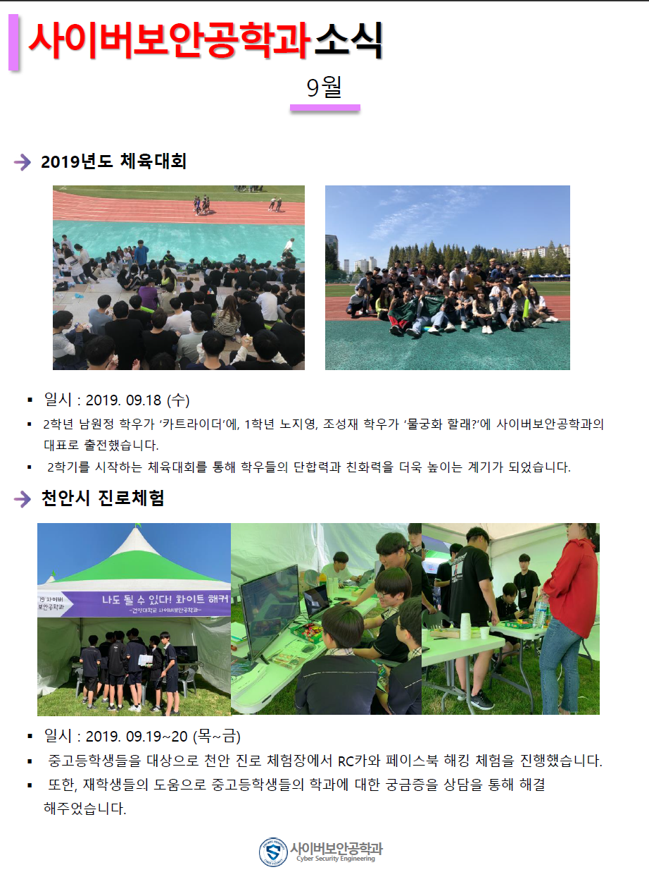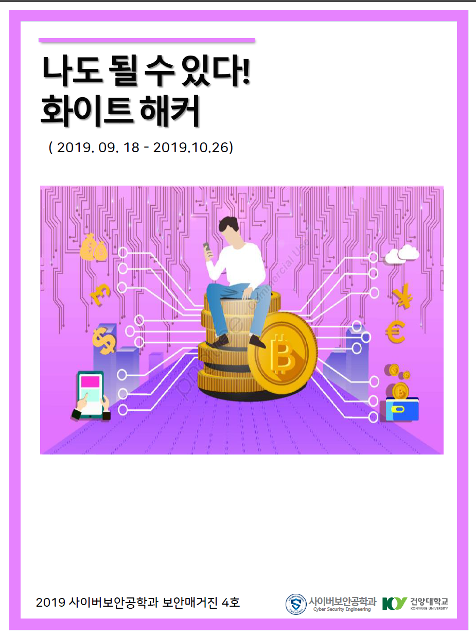 『 사이버보안공학과 보안매거진 2019-4호 』글의 상세내용을 확인하는 표로 제목, 부서명, 등록일, 조회, 첨부, 내용으로 나뉘어 설명합니다.