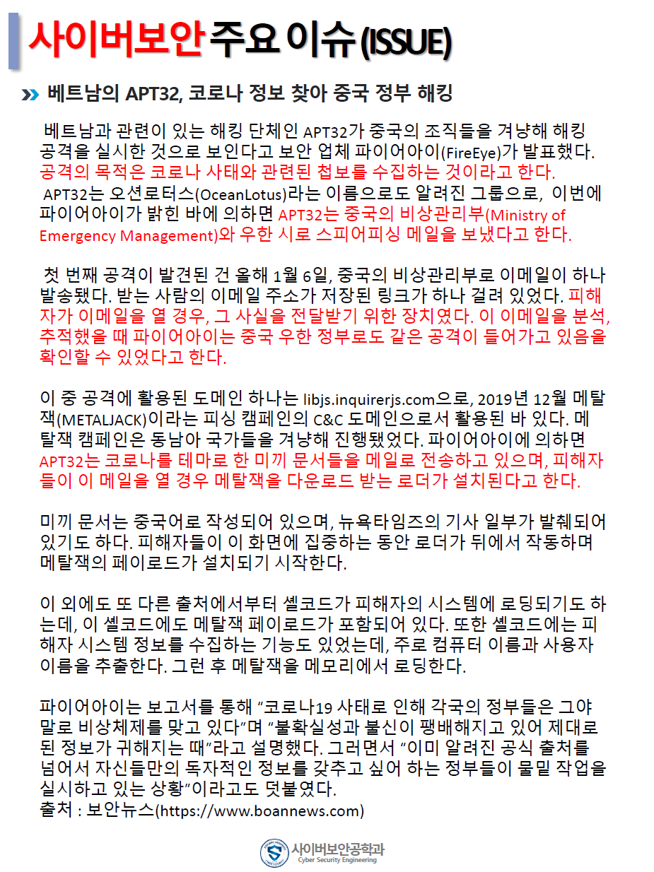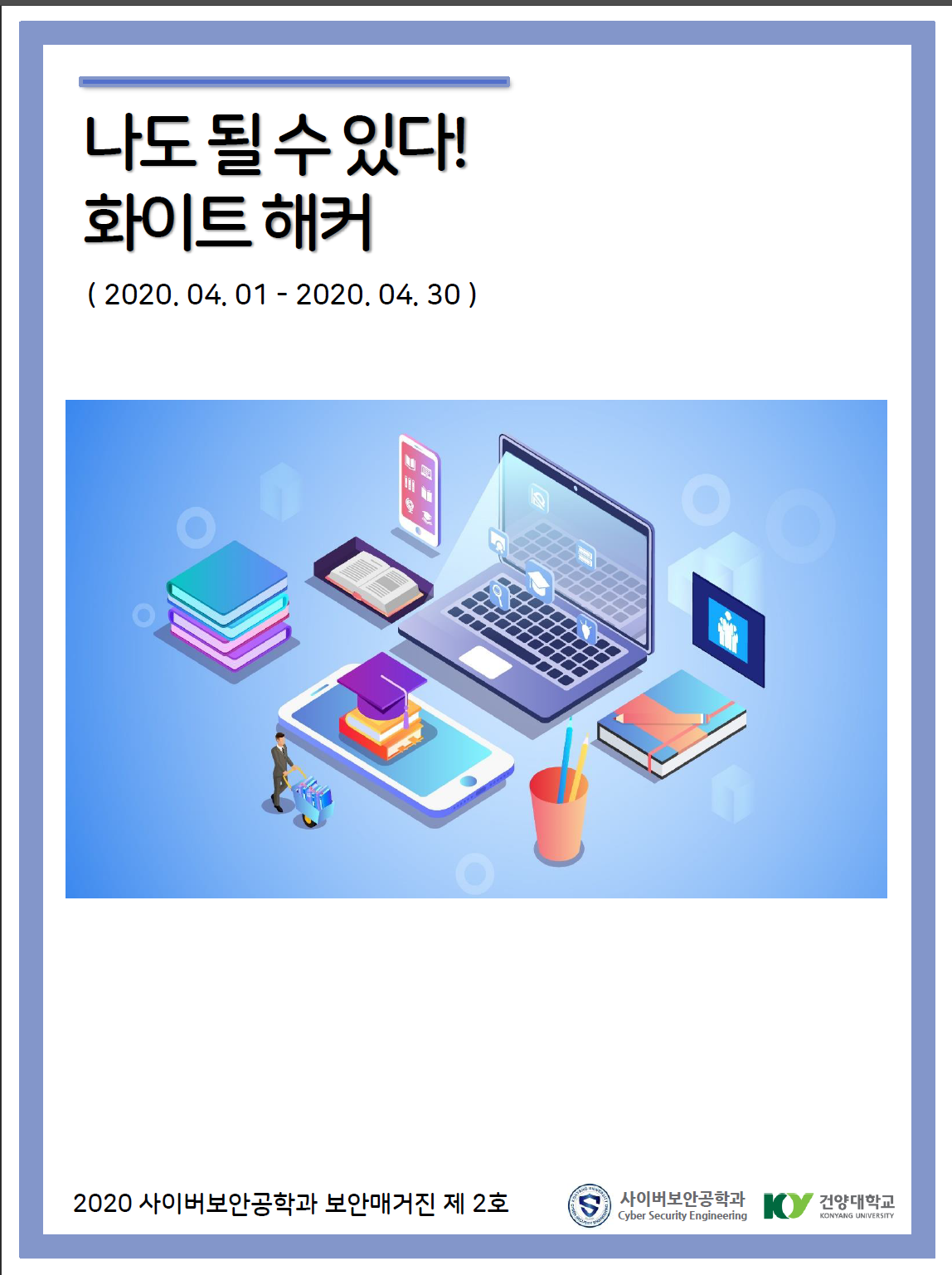 『 사이버보안공학과 보안매거진 2020-2호 』글의 상세내용을 확인하는 표로 제목, 부서명, 등록일, 조회, 첨부, 내용으로 나뉘어 설명합니다.