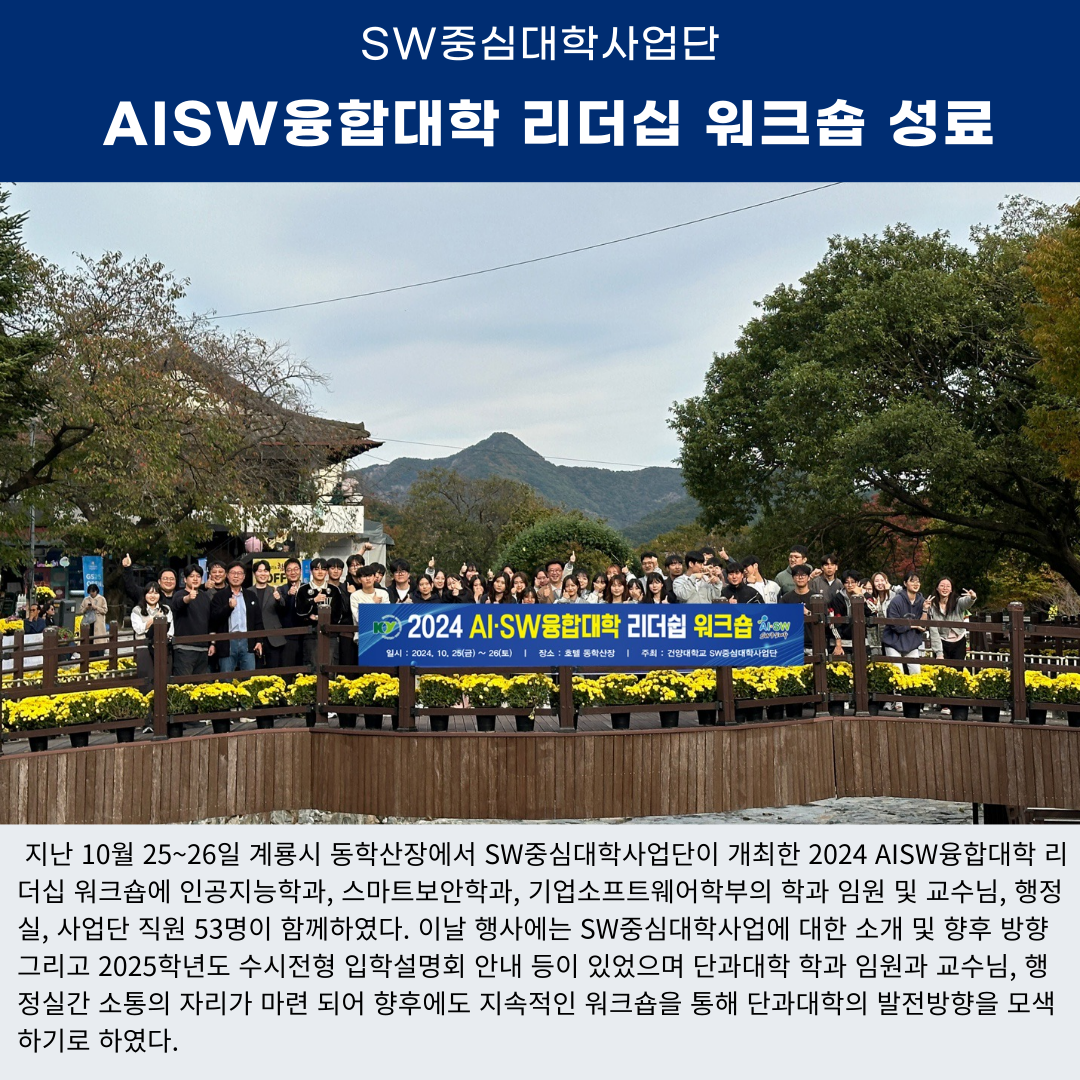 『 AISW융합대학 리더십 워크숍 개최 』글의 상세내용을 확인하는 표로 제목, 부서명, 등록일, 조회, 첨부, 내용으로 나뉘어 설명합니다.