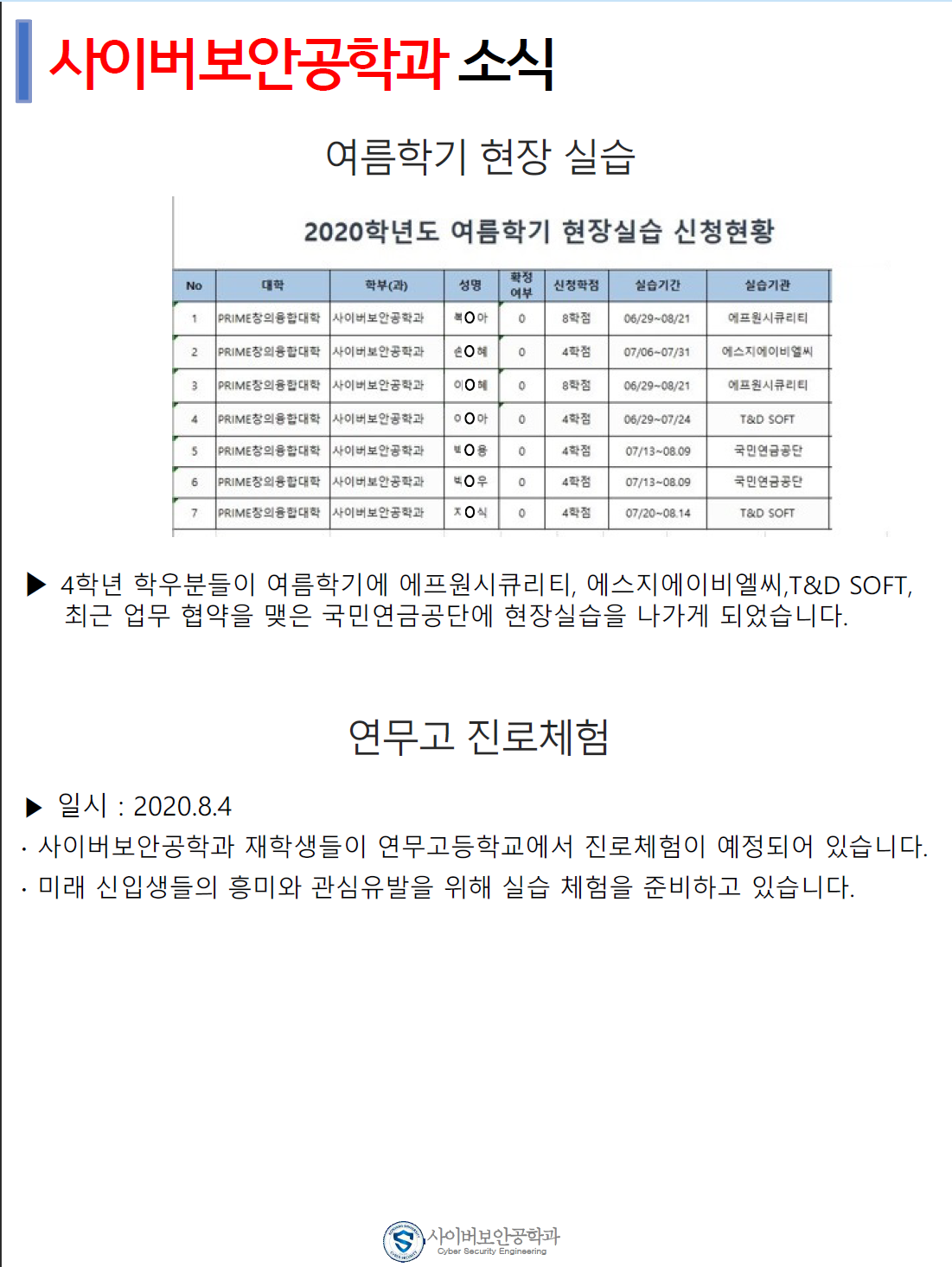 『 사이버보안공학과 보안매거진 2020-4호 』글의 상세내용을 확인하는 표로 제목, 부서명, 등록일, 조회, 첨부, 내용으로 나뉘어 설명합니다.