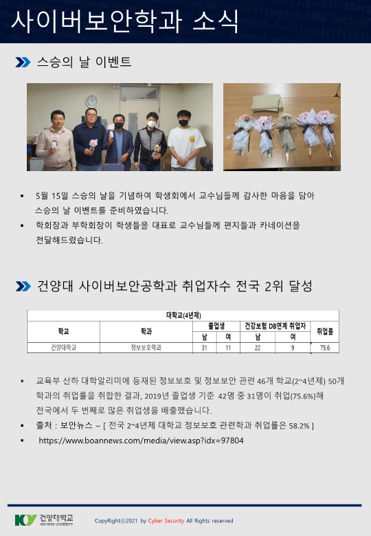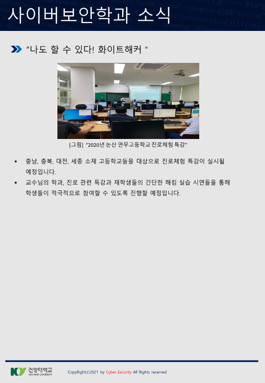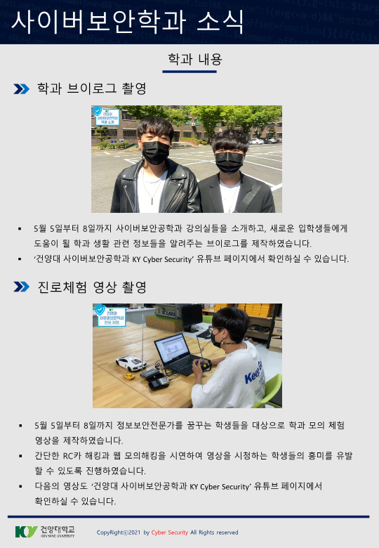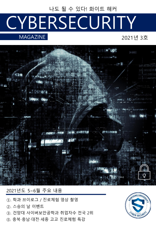 『 사이버보안공학과 보안매거진 2021-3호 』글의 상세내용을 확인하는 표로 제목, 부서명, 등록일, 조회, 첨부, 내용으로 나뉘어 설명합니다.