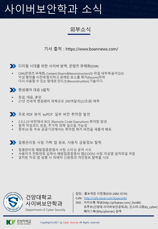 『 사이버보안공학과 보안매거진 2021-4호 』글의 상세내용을 확인하는 표로 제목, 부서명, 등록일, 조회, 첨부, 내용으로 나뉘어 설명합니다.