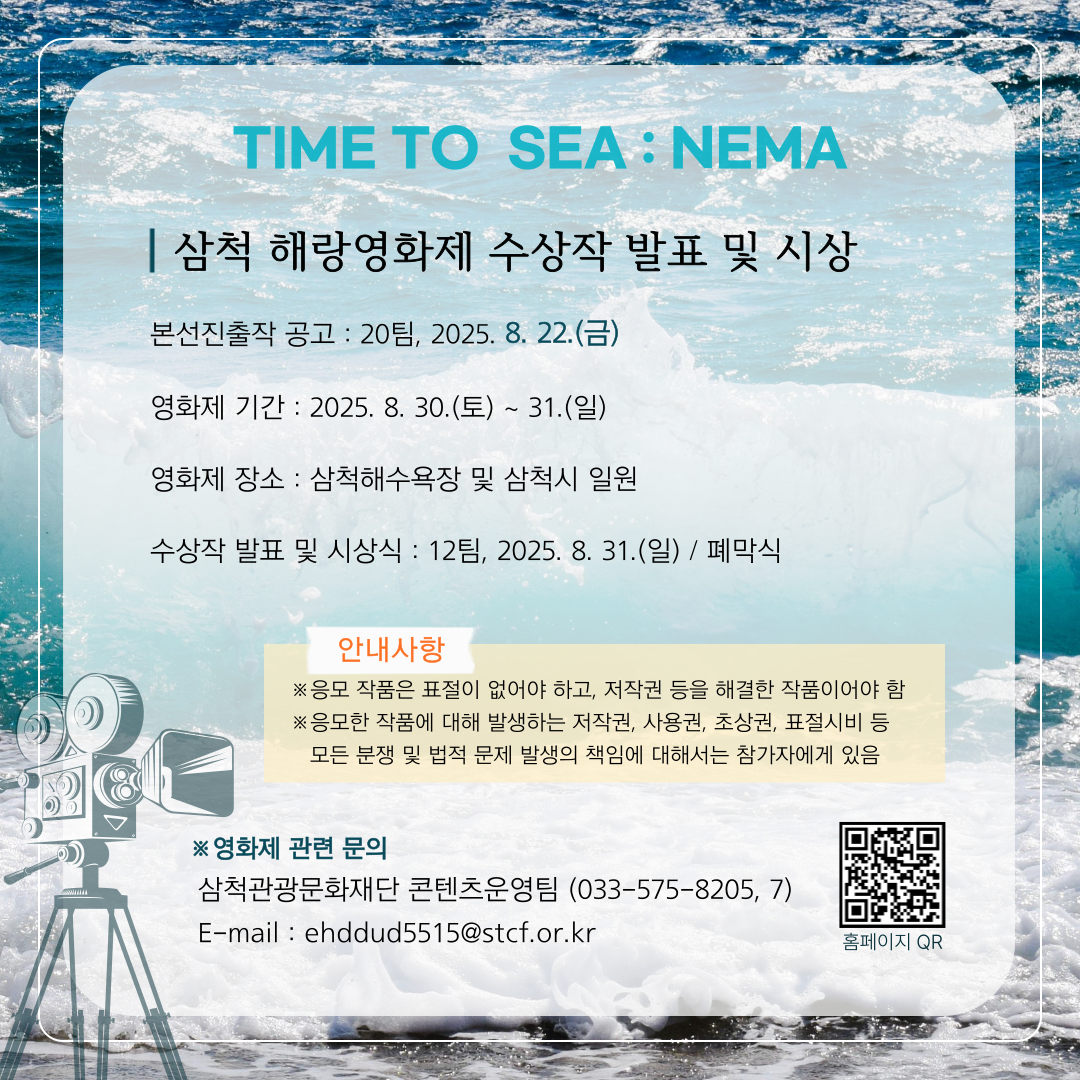 ○ Key color : DEEP BLUE - 짙푸른 바다 깊은 곳의 공포감, 신비감, 미지의 탐색 표현 ○ 기 간 : 2025. 8. 30.(토) ~ 2025. 8. 31.(일) ○ 주요내용 - 거장의 영화 : 임권택 감독 특별展 - 전국 규모 단편영화 공모전 - 공포와 신비를 탐험하는 특별 섹션 무비 테마파크 : DEEP BLUE - 영화상영, GV, 무비리뷰어, 삼척영화 팝업존 등 부대행사