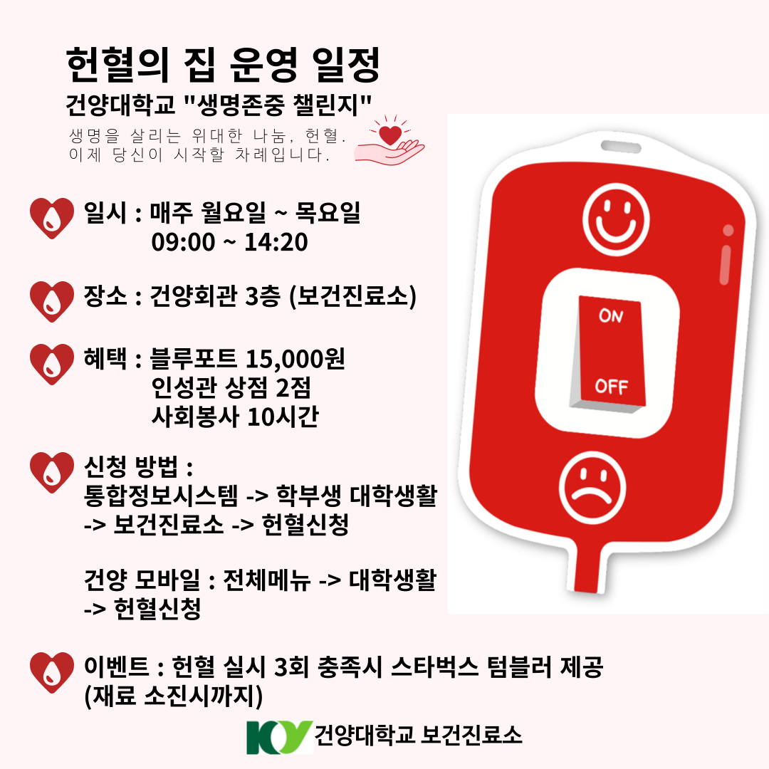헌혈 기간 : 03.10(월) ~ 12.12(금)/방학기간 제외 매주 월요일 ~ 목요일 09:00 ~ 14:20 헌혈 장소 : 건양회관 3층 보건진료소(041-730-5179)