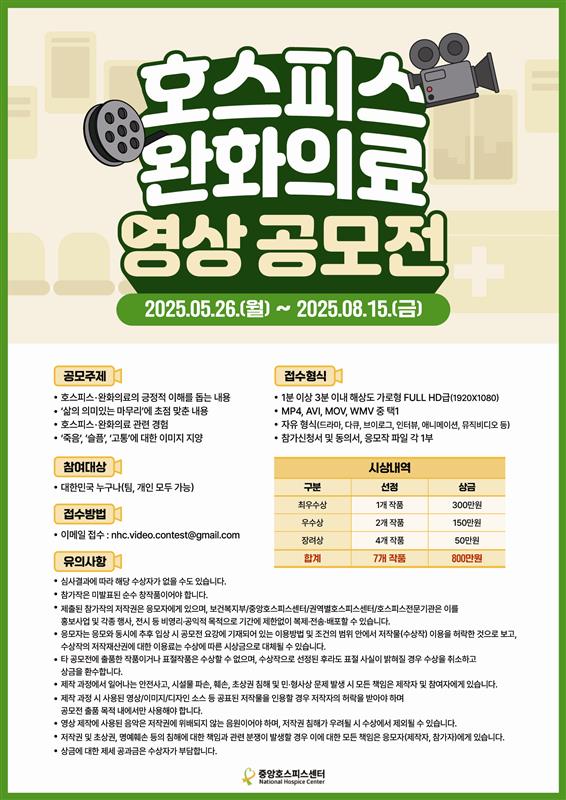 | 제목 | (공모전 안내)호스피스 완화 의료 영상 공모전 | ||||