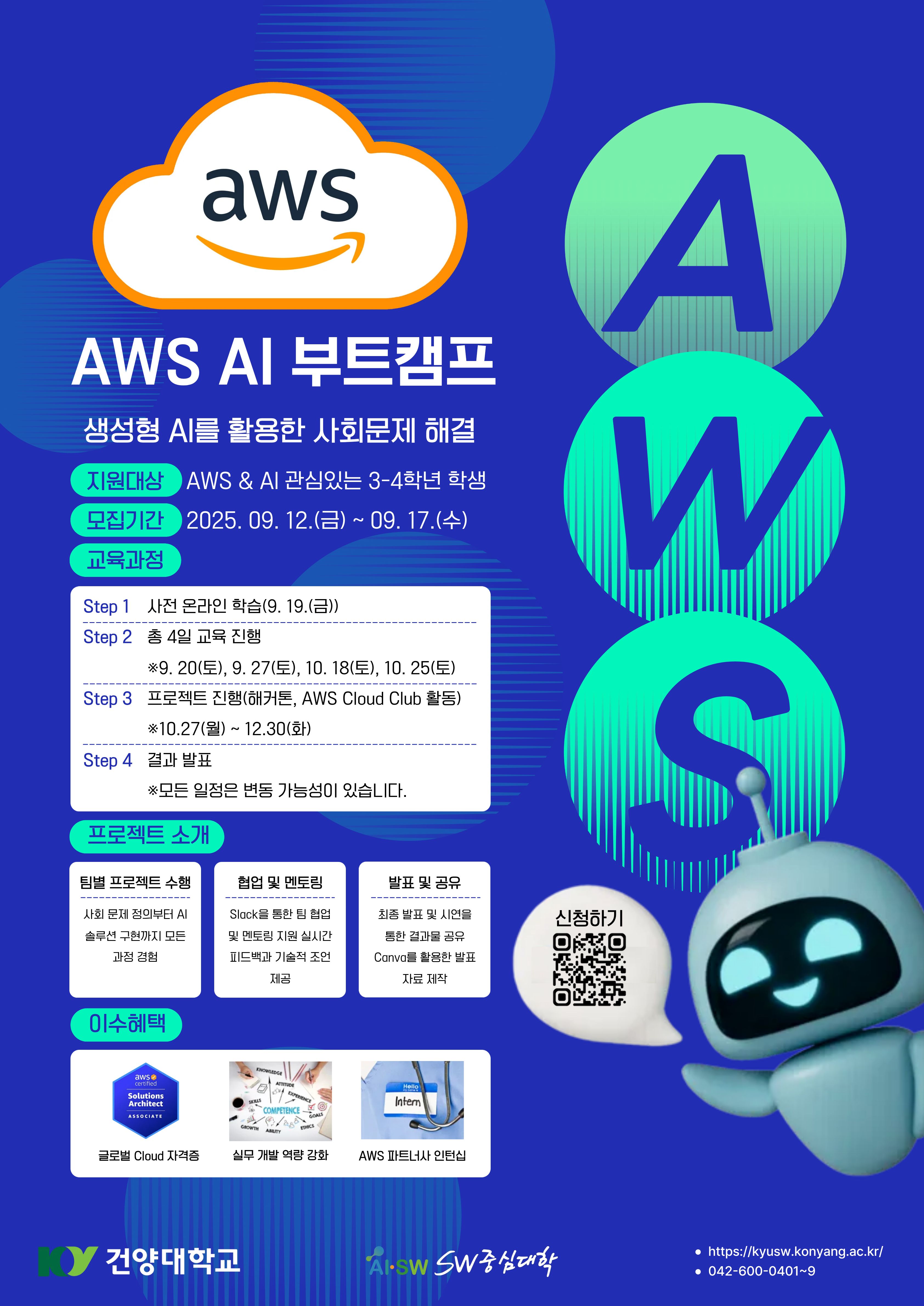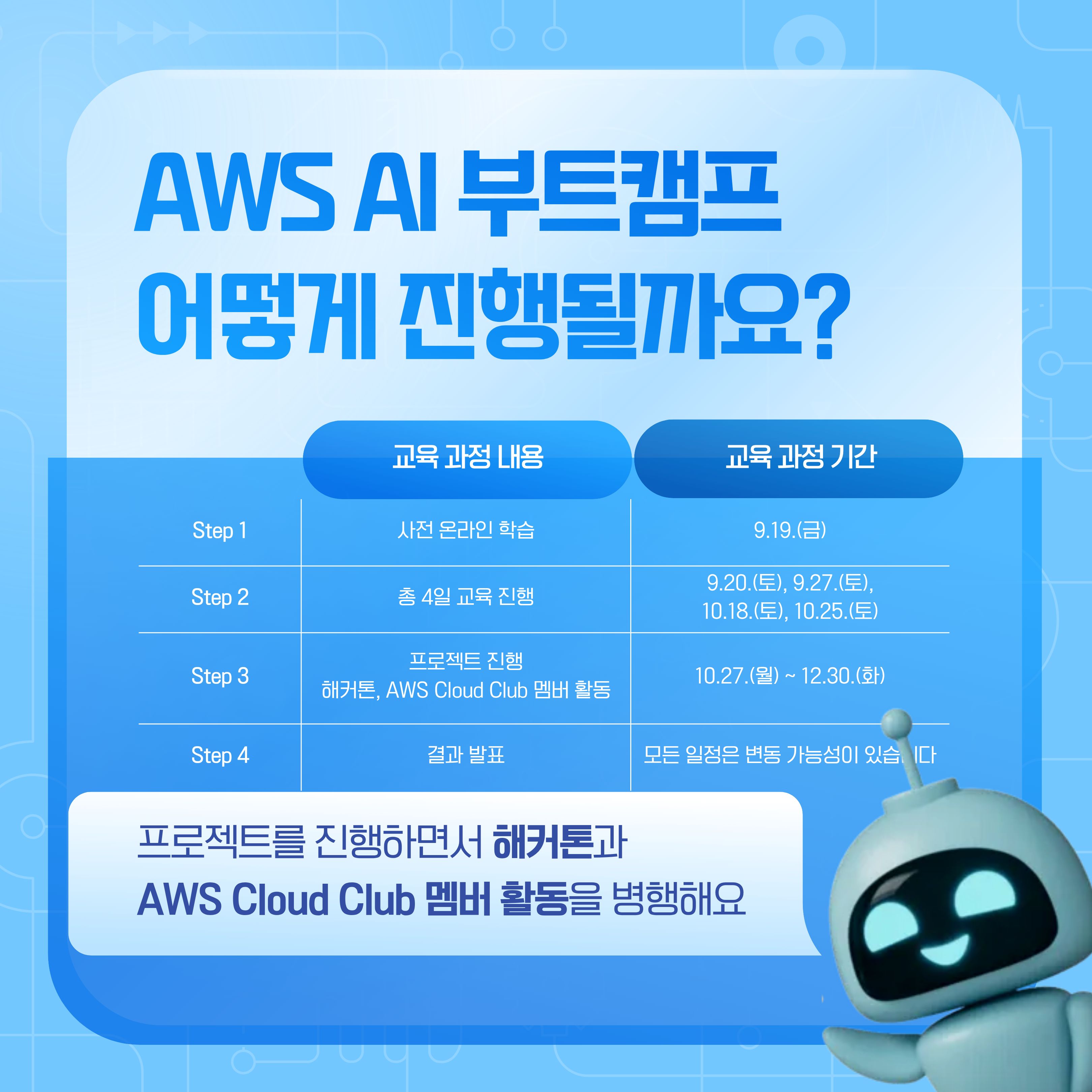 『 AWS AI 부트 캠프 』글의 상세내용을 확인하는 표로 제목, 부서명, 등록일, 조회, 첨부, 내용으로 나뉘어 설명합니다.