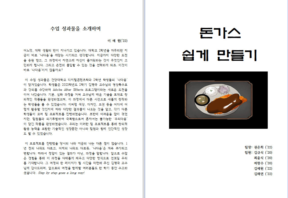 디지털콘텐츠학과 3학년 학생들은 지난 학기 수업인 영상특수효과 수업(담당: 김병국 교수)에서 자신들이 활동한 결과물을 『하랑의 날개짓: 함께 도약하는 미래』란 이름으로 제작했다. 학생들은 이 과목을 통해 애프터 이펙트의 여러 기능과 활용을 익혀 다양한 모션그래픽을 제작하는 방법을 익히고, 그것을 이용해 팀 활동을 통해 작품을 제작하였다. 이 성과물은 영상특수효과의 과제물을 제작하면서 각 단계의 결과물들을 모은 것으로 ‘기획 의도, 시놉시스, 시나리오, 콘티, 영상, 활동 후 느낀 점’ 등으로 구성되었는데, ‘돈가스 쉽게 만들기, TVing 광고, 배달의 민족 CF, Goodbye Summer(뮤직비디오), 세상’ 등이 그것이다. |