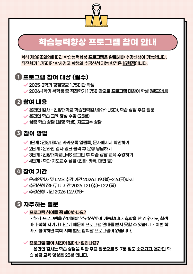 『 2025-2학기 학사경고 학습능력향상 프로그램 안내 』글의 상세내용을 확인하는 표로 제목, 부서명, 등록일, 조회, 첨부, 내용으로 나뉘어 설명합니다.