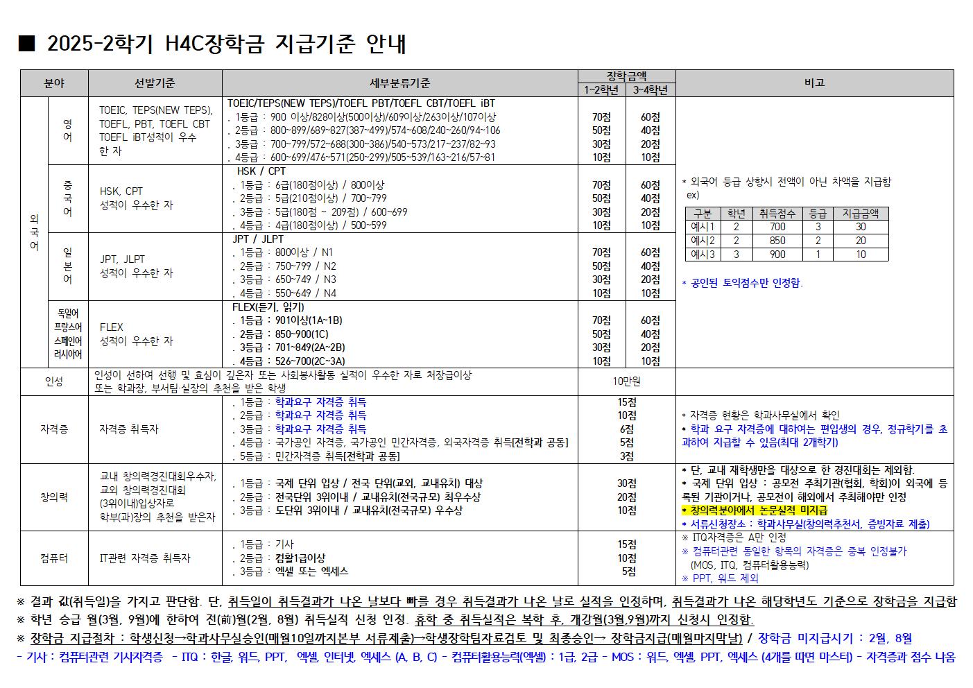 『 2025-2학기 H4C장학금 지급 기준 안내 』글의 상세내용을 확인하는 표로 제목, 부서명, 등록일, 조회, 첨부, 내용으로 나뉘어 설명합니다.