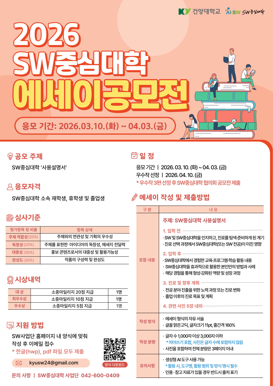 『 2026 SW중심대학 에세이 공모전 』글의 상세내용을 확인하는 표로 제목, 부서명, 등록일, 조회, 첨부, 내용으로 나뉘어 설명합니다.