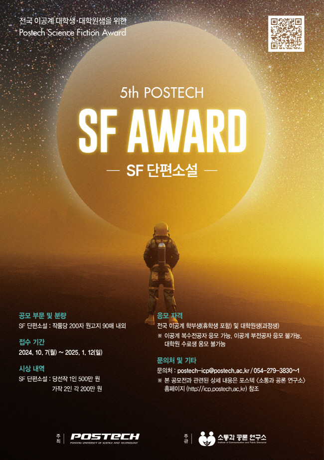 『 제5회 포스텍 SF 어워드 공모전 』글의 상세내용을 확인하는 표로 제목, 부서명, 등록일, 조회, 첨부, 내용으로 나뉘어 설명합니다.
