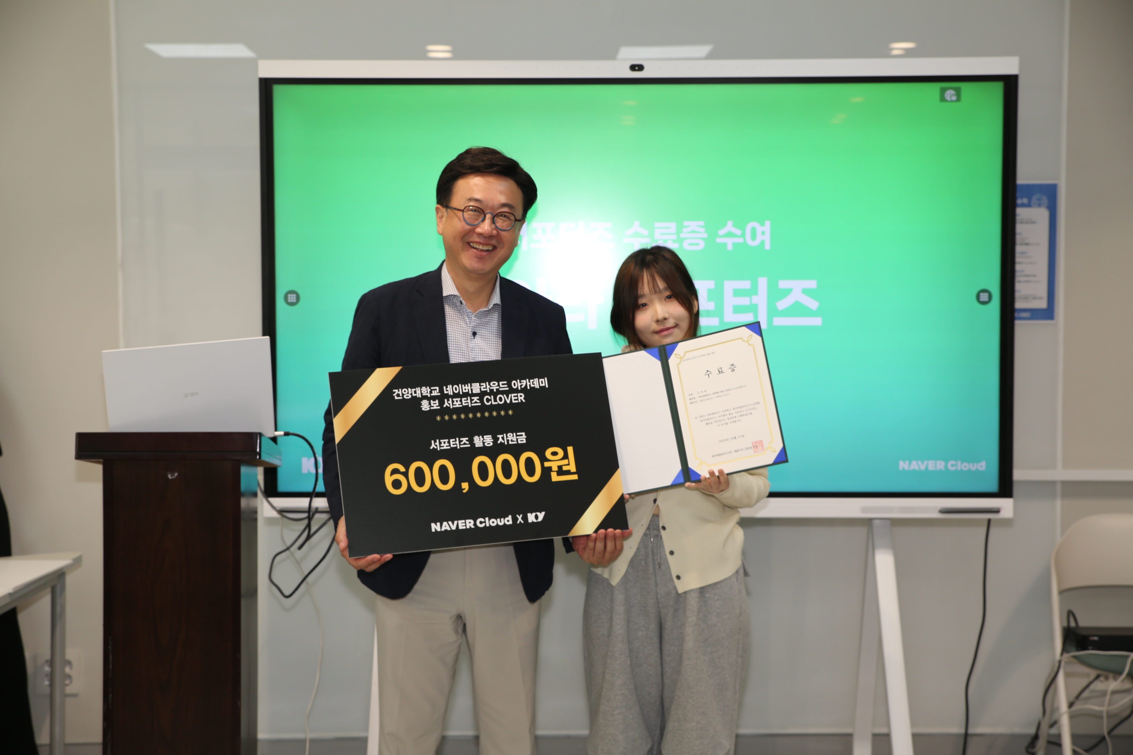 『 건양대학교 네이버클라우드 아카데미 홍보 서포터즈 CLOVER 1기 활동 』글의 상세내용을 확인하는 표로 제목, 부서명, 등록일, 조회, 첨부, 내용으로 나뉘어 설명합니다.